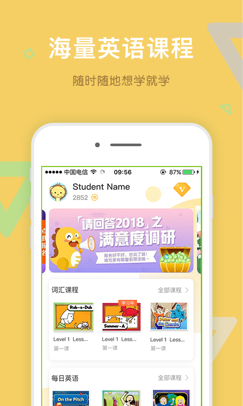 效率学,个性化课程内容,AI智能化指导等学习方法,处理孩子英语学习全过程中的学习枯燥乏味、难坚持不懈、没有时间的难点,让小孩喜爱学,能听得懂,信心说。 1、游戏化学习 手机游戏冲关式的学习感受,像打游戏一样学习英语,让孩子学习根本停不下来。 2、教导主任全程守候 巧练英文装有教导主任手机微信教育督导具体指导服务项目,激励具体指导小孩,协助父母催促孩子学习。 3、碎片时间高效率学 研究表明,短时间高频率学习,学习实际效果更优。巧练英文选用分小节的学习方式,一小节十分钟,晨读、午餐、入睡随时学习英语。 4、个性化课程内容,AI智能化指导 人机