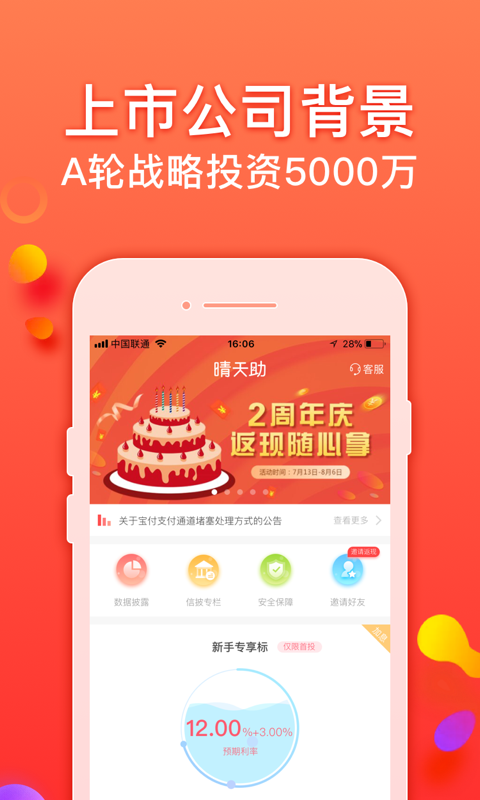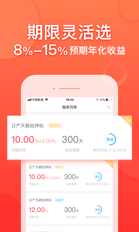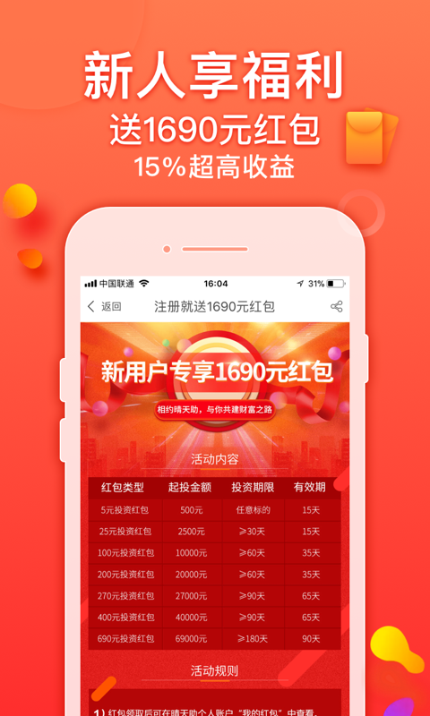 【平台惊喜】 1,新用户注册免费送1690元投资红包; 2,月月精彩活动,加息,红包,话费,苹果手机应有尽有; 3,期限灵活30天~300天期限自由选择; 4,100元起投; 【平台优势】 1,荣获5000万元A轮融资; 3,获批ICP许可证; 4,浙江省投融资协会会议单位; 5,上饶银行存管; 6,高准入机制,每项借款标的必须足值匹配抵押物; 7,客户资金通过银行监管账户审核,实名认证同卡进出 【友情提醒】 邀请好友,拿更多