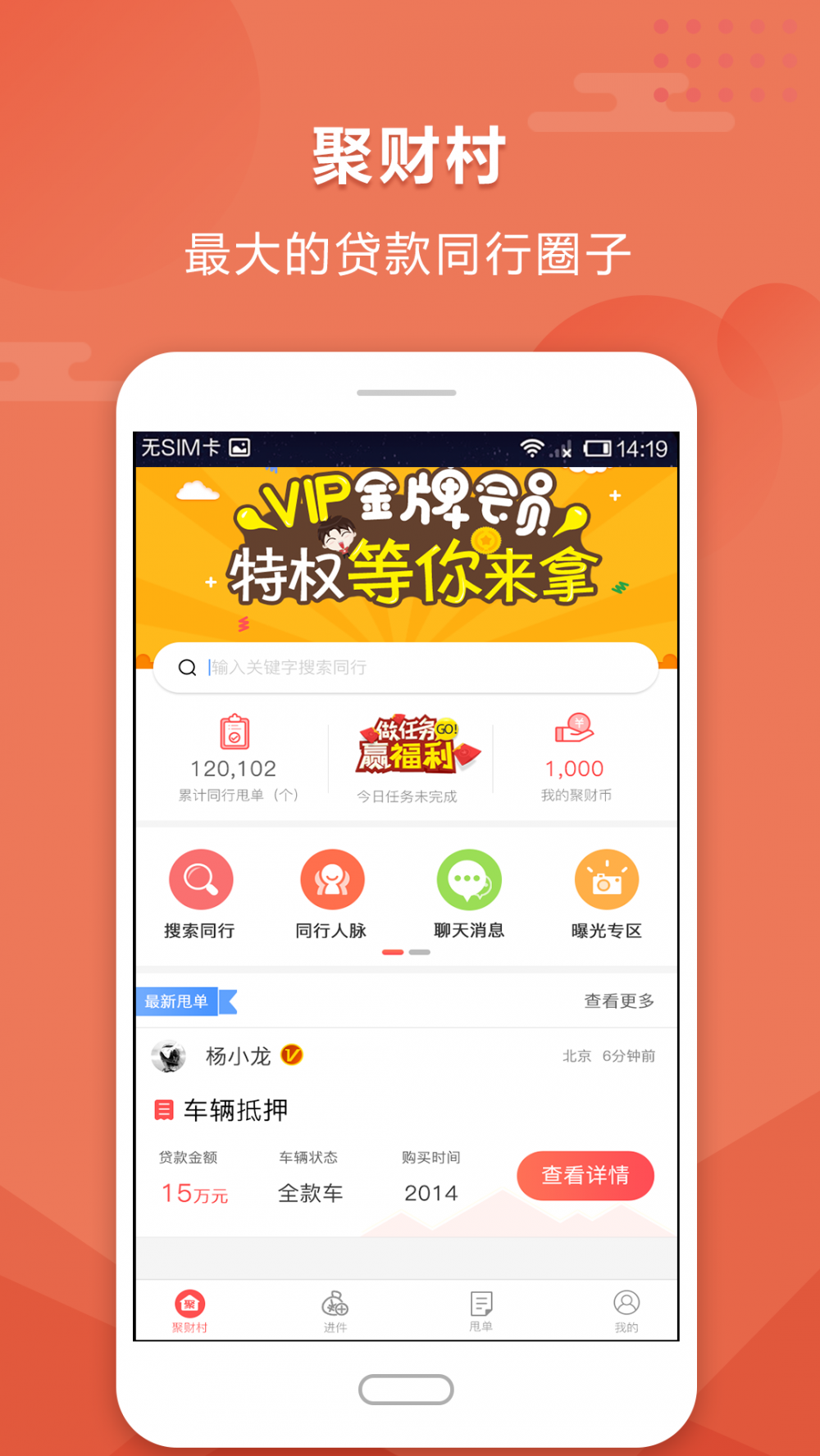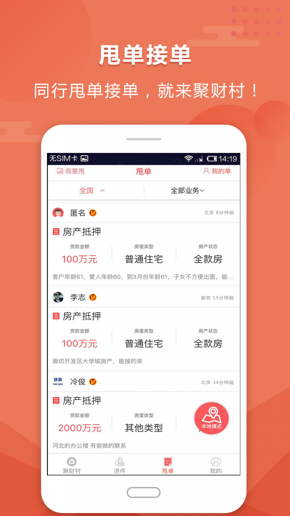 效率,轻轻松松完成收益增长。 -甩单 信贷从业者用户能够 朝向海量同行业开拓市场沟通交流、甩单接单子,提高订单消化吸收工作能力。在聚财村平台甩单,商谈高效率高些。 -人脉关系 聚财村平台集聚了中国各省海量的信贷从业者用户,能够 实时查询周边的同行业,还可以根据业务类型、企业等层面信息搜索同行业数据信息,迅速扩展同行业人脉关系。