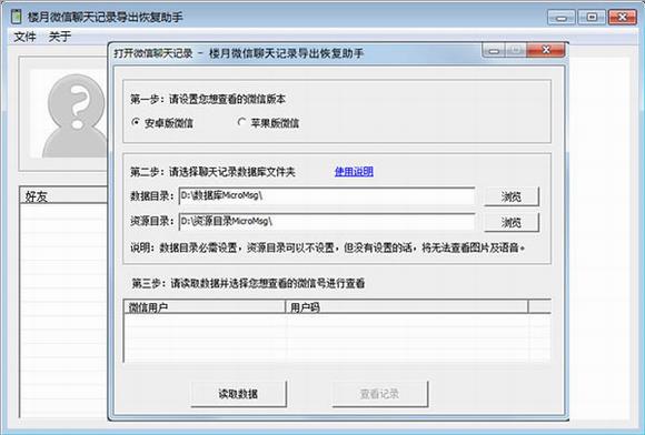 第2步,开启楼月微信聊天记录导出恢复助手APP,设定好微信旧版本(苹果版微信或是安卓版微信),并挑选刚刚导出的聊天记录的Documents文件夹(我们在第1步中,将苹果手机微信微信聊天记录的Documents导出来在了D盘的根目录下),随后点一下“接收数据”按键,再挑选一个想载入的微信号码,并点一下“查看记录”按键,下面的图所显示
