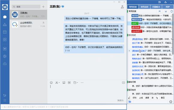 一键回应表明处理同样问题反复回应,电脑打字又累又低效能的问题客服宝能搜集您常见的出色回应销售话术,并全自动吸咐在一切闲聊对话框旁,只需电脑鼠标一点,一键推送,省时省力高效率,无需再艰辛电脑打字,也无需繁杂地从文本文档中拷贝