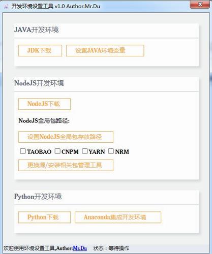 开发环境设置工具精简版是一款专用型开发工具一键配备APP,适用于Java开发工具、nodejs开发工具和Python开发工具的配备,其具有了简易形象化的操作界面,挑选相对应的开发工具控制模块,随后挑选相对应的作用,就可以迅速进行配备,值得一提的是,其带来了包括SDK在线下载、设定JAVA系统变量、NodeJS在线下载、设定NodeJS全局性包储放途径等各种作用,有兴趣的朋友们赶紧免费下载。