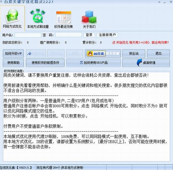 百度关键字优化精灵最新版是一款可以协助网站站长关键词优化进而有效的提升关键词排行的专用工具,针对站长或是站群系统来讲,好的关键字才能提供总流量,百度关键字优化精灵就可以处理这个问题。手机软件选用p2p互帮互助基础理论开发设计的百度搜索引擎关键字优化专用工具,提高网站排名平稳快速,与此同时也可以让你网站代理极大总流量,刷关键字排行、刷流量。有须要的朋友们欢迎大家前去免费下载。
