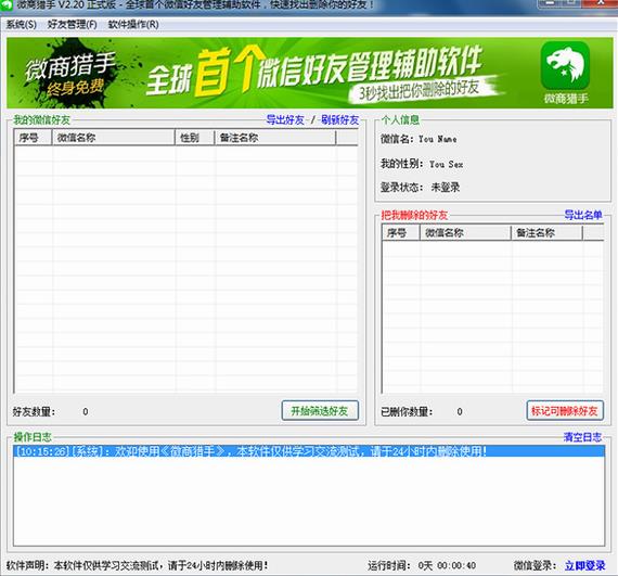 微信猎手官方网绿色版是一款微信朋友可视化工具,可以迅速寻找删掉您的朋友并开展标识,与此同时也可以见到全部朋友微信名称、性別、备注名称这些。此外,还可以找到删除了你的朋友,道别丧尸朋友,也有其他多种多样作用,等着你探寻。有兴趣的朋友们欢迎大家前去免费下载。