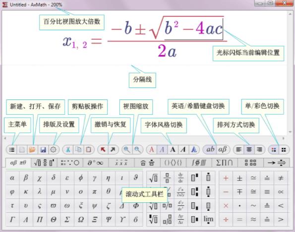 图形界面的排版布局设置,排版设计比较方便;适用点取键入、键盘快捷键、脚本制作键入,键入迅速;适用AMS/LaTeX符号规范;适用自定符号;适用迅速引流矩阵模版、填充及分层;适用字符串数组搜索与更换;适用手记(多帧剪切板)、开始菜单与公式计算库;适用多背景色标记控制面板,适用标记控制面板重投射;适用纯色和五颜六色,可自定义颜色喜好;编写功能,可自动检索预置字段名并校准其文字格式。