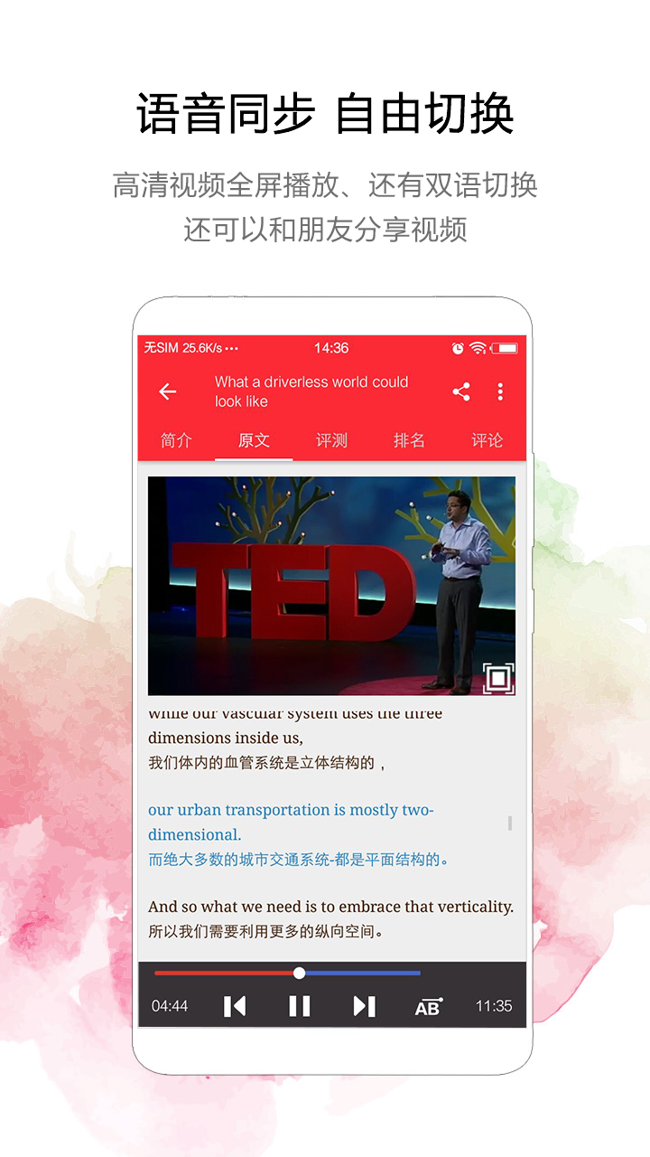 为了更好地协助大伙儿能在一个轻轻松松、轻快的自然环境下学英语,尤其是提高英语口语的跟读能力,爱语吧对于TED英文演讲视频开发设计看此运用英中双语字幕随时随地转换,尺寸色调可随意调整,假如想锻炼口语你能开启测评作用,跟随台子上的演讲人一起训练口语,大家的人工智能技术会得出精确的得分。让大伙儿在倾听各行各业奇特逻辑思维的另外,快乐成长词汇英语,英语的语法,使用方法。在提高逻辑思维能力,开阔视野的另外,提升英语表述能力和感召力。关键艺术创意与作用以下: 一、 爱语吧特有TED英文演讲,联接一切“有志改变命运的人”,让用户开阔眼界,锻炼逻辑思维,提高听力和口语。 二、 对于大量视频,将视频分了十大类,让用户更强挑选。 三、 您能够在线