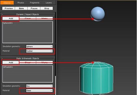 实现了图形建立后,客户就可以用RayFire的目标控制面板(Objects)将圆球界定为动态性目标,为圆球增加作用力实际效果;与此同时,将带陡坡面圆柱界定为静态数据目标,确保其原地不动状态,来承揽圆球的撞击。