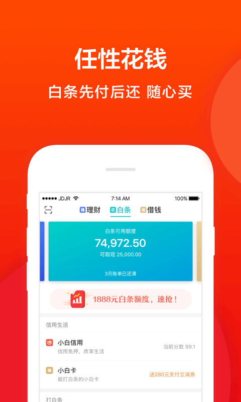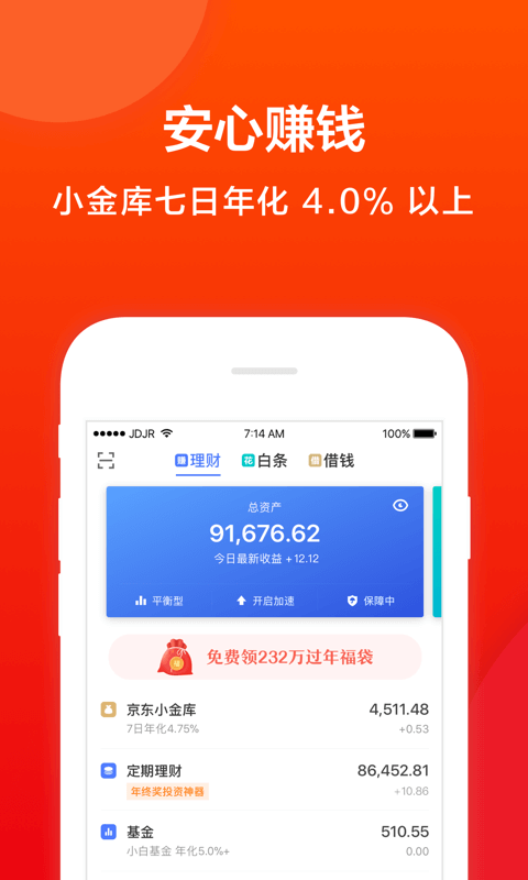 京东平台App——有温度的一站式金融业生活综合服务平台 你过哪些生活,你就是谁 别让生活挑选你,挑选你需要的生活 就算这并不易,就算有时候你宁可坚信运势 但始终记牢,幸福的生活从不容易莫名其妙而成 一点一滴的更改,如星火燎原,都会红新 我希望永远相信 把生活过得精美,该来的都会来 京东平台App,每日给你的生活加一点溫度——在这儿,您能够轻轻松松处理和“钱”有关的难题:【安心挣钱】【任性掏钱】【轻轻松松借款】【付款划算】【尽情谈爱】,更有小白理财、商业保险、日历表、早起打卡、等人性化服务。 【安心挣钱】 定期公款私存,7日年化盈利4%之上,超大金额转到急速到账。 按时、股票基金、个股、金子,类目齐备,灵便稳进。 特有“基智帐户”,为您出示科学研究技术专业的机构持股提议。 【任性掏钱】 买东西白条支付,每一笔免息分期,分期付款有特惠。 生活用分期付款,室内装修、购车、租房子无需愁。 【轻轻松松借款】 借款用黄金,免申请办理到账快,息费更划得来。 诸多出资方任你挑选,简易审批,急速下款。 【任性掏钱】 线上与线下用东付,特惠多多的,愉快享受生活; 中国众筹网站,最in好玩儿的时尚潮流好货; 水电煤缴费、信用卡还贷、话费充值、给油专购优惠……满足你的生活所需。 【大量服务项目】 小白信用:方便快捷的酒店住宿出行,打开全新个人信用生活 保险业务:身心健康、资产、出行、出现意外、养老服务,有商业保险,更安心 日历表:投资理财产品期满,京东白条还贷,爆品商品预告片等…关键的事儿,已不错过了 早起打卡:美好的一天,从早上刚开始,每天趣味性打卡签到,刮分懒虫大红包,塑造身心健康生活良好的习惯 加快盈利:轻轻松松做任务,给你的资产总额提高盈利哦