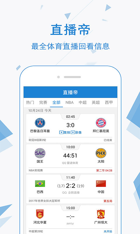 直播帝--一起来看足球队篮球赛排球中超联赛英超联赛西甲NBA体育直播吧! 直播帝提供NBA、中超联赛、英超联赛、西甲、亚冠联赛、欧洲冠军杯、CBA、德甲联赛、意甲联赛、中甲联赛、排球、斯诺克台球、乒乓球赛、网球、羽毛球、F1、足球队和篮球赛等即时即时比分视频直播回看信息。 直播帝提供多通道视频在线观看信息、现场直播和不一样讲解,提供锦集和整场,另外提供CCTV5在线视频直播、广东体育、北京体育、五星体育、劲爆体育、风云足球、新浪体育、pptv体育、暴风体育、虎扑体育和企鹅直播等直播间信息,让我们一起看来体育直播吧。 【所有比赛】包含NBA、中超联赛、英超联赛、西甲、亚冠联赛、欧洲冠军杯、CBA、德甲联赛、意甲联赛、中甲联赛、排球、斯诺克台球、乒乓球赛、网球、羽毛球、搏击、F1等频道栏目。 【比赛频道栏目】提供各比赛的直播回看、赛程安排比赛结果、新闻报道速运、精彩表演、經典回看、数据信息等信息。 【即时战况】提供足球队、篮球赛、排球、乒乓球赛、网球、羽毛球的即时即时比分,已不错过了每一分的精彩纷呈。 【数据统计分析】提供技术性统计分析、彼此对战历史时间和最近战况、欧赔(亚赔、欧赔和大小球)等数据信息,给你真实保证懂球帝。 【发觉频道栏目】提供直播电视、掩藏战况和好用材料等作用。