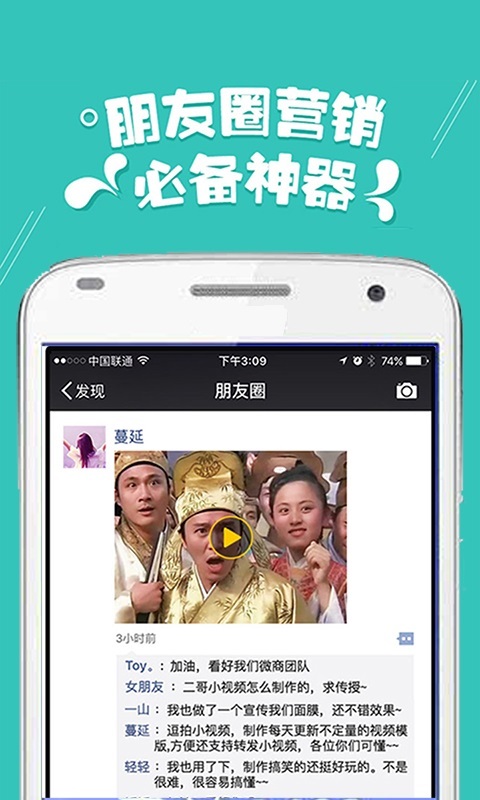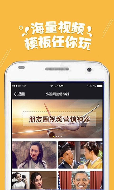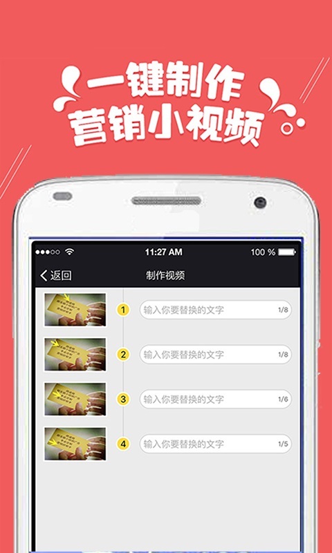 1分钟制做微商代理小视频,情景丰富多彩的营销推广模板,也有”偶像明星”来配声,2017让微信营销更合理! 大家出示1000套之上视频模板,还能效仿大牌明星响声为您的视频配声。 不仅有如大牌明星手举牌、富豪房产证、洪荒之力等网络热点,也有如感情沙画、房屋告白、纪念相册图片、婚礼邀请函、微商代理宣传策划小视频、企业宣传视频等情景视频。大家会发掘大量好玩儿的图片和视频模板,定时执行上架,给你紧随微信营销。 关键特色 【效仿大牌明星】客户一键制做视频,还能完全免费挑选效仿大牌明星特色响声做配声 【装bi神器】丰富多彩多种多样的搞怪图片模板,与网络热点紧密联系,装B也时尚潮流 【大片制做】很多的流行视频模板,随意选择,总会有属于你的高逼格大片 【便捷制做】要是简易更换文本和图片,就可以一键生成你的高逼格图片和视频 【消息通知】视频著作生成进行后,会出现信息促进通告您,应用全过程更暖心 【一键共享】一键发送到微信朋友圈、QQ等社交媒体运用,散播共享与手机上储存更轻轻松松 丰富多彩情景 【普通用户】微信朋友圈发图显摆装B,在感情、生辰、婚宴等情景下的祝愿和纪念视频等 【公司客户】房地产、金融业、轿车、餐馆等领域品牌宣传、企业形象宣传等,及其销售员对外开放市场销售时的视频个人名片 【微商代理客户】微信朋友圈搞笑幽默小视频,提高微商品牌在微信朋友圈宣传策划的认知度和顾客总流量
