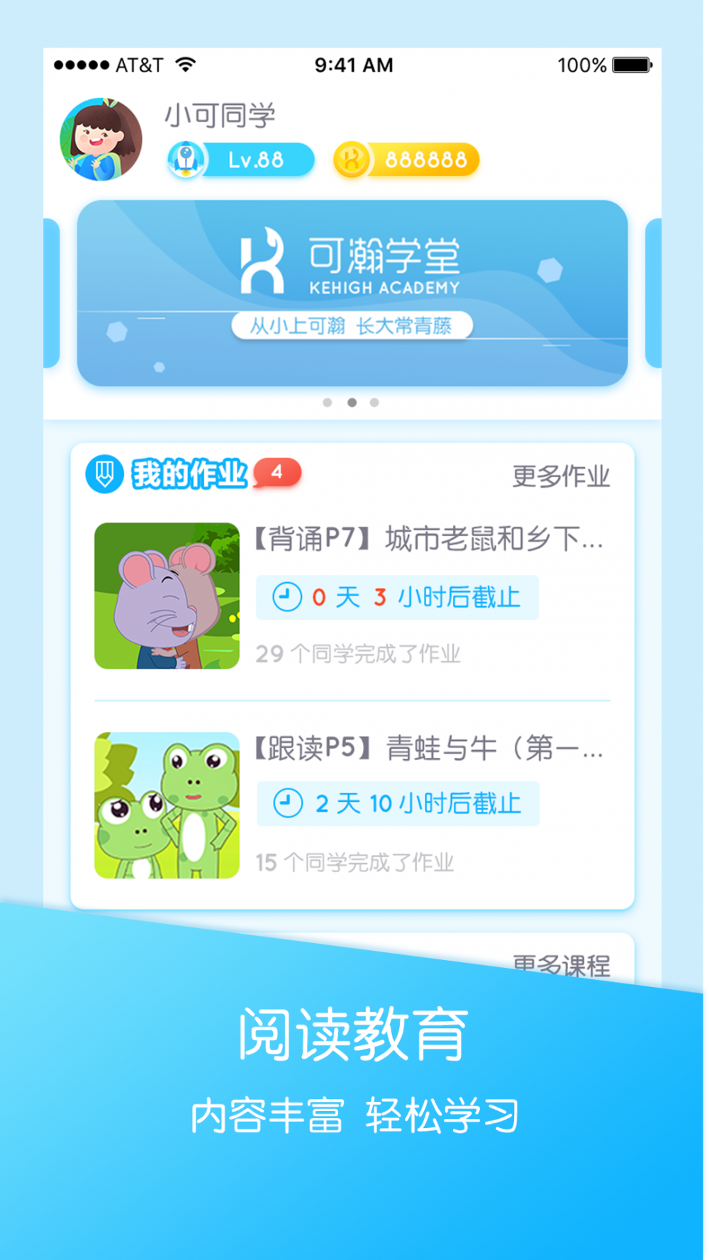 游戏化鼓励、人工智能技术剖析等技术性,很多节省父母陪考陪学時间,巨大提升 学员学英语的主动性,充足降低老师审阅作业的時间,轻轻松松把握学员学习状态,是中小学生学习指导和老师课堂教学的好助手。 可瀚学堂学生端 1,看动画片学习英语,迅速提高口语和英语听力 伊索寓言精致