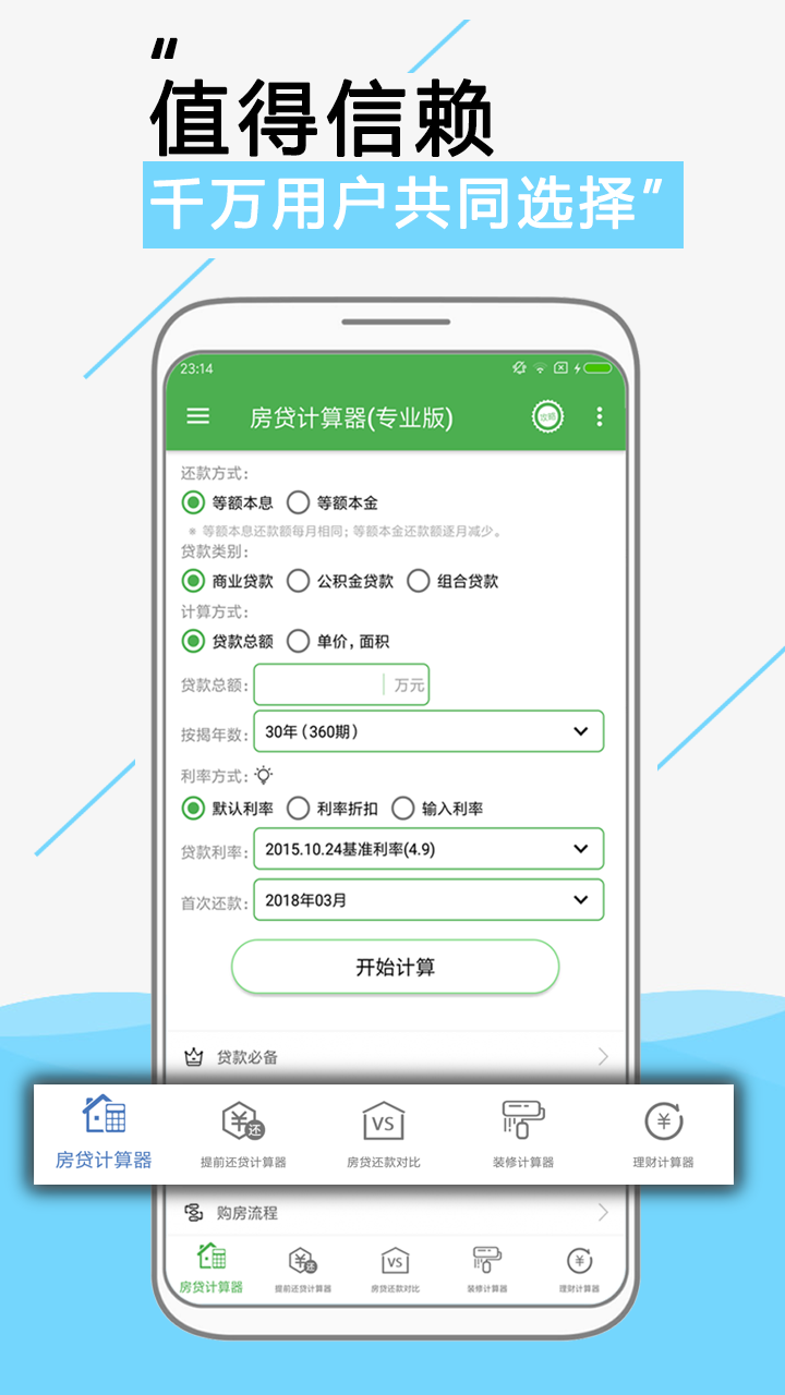 购房何必省吃俭用。六年来,干万客户相互的挑选,可信赖。住房贷款难题一款APP全拿下,更强的协助您挑选合适自身的住房贷款方案。回绝被坑骗,我的住房贷款我做主。 是一款完全免费、技术专业、计算精确的住房贷款计算器。已升級到2018年04月十五日利率。 1、全新升级的页面、全新升级的互动方式、全新升级功能感受。大家一直在勤奋,一直被效仿,从没被超过。对,大家一直认真在服务项目。 2、支持住房贷款计算、提前还房贷计算、住房贷款还款比照、剩下还款计算、新房税费计算、二手房税费计算、即时利率查看、买房工作能力评定、买房秘笈、住房贷款注意事项等多种多样住房贷款有关功能, 3、“室内装修计算器”功能,支持木地板、墙纸、窗帘布、建筑涂料、地板砖、墙面砖等室内装修用材计算。 4、“投资理财计算器”功能,支持存款、定期理财、定投理财、年收益率等计算。 5、支持1-30年借款, 6、支持借款总金额、价格与总面积、借款折数计算。 7、支持自定利率或挑选规范利率表,支持设定利率有关折扣。支持利率下幅6折~上调1.4倍等常见利率折扣。 8、出示每个月详尽的等额本息还款和等额本金还款的商业服务还款汇报/个人公积金还款汇报/总还款汇报。 9、更加形象化的统计信息及按揭数据图表,一目了然的按揭数据信息,让您的更清楚形象化掌握数据信息。