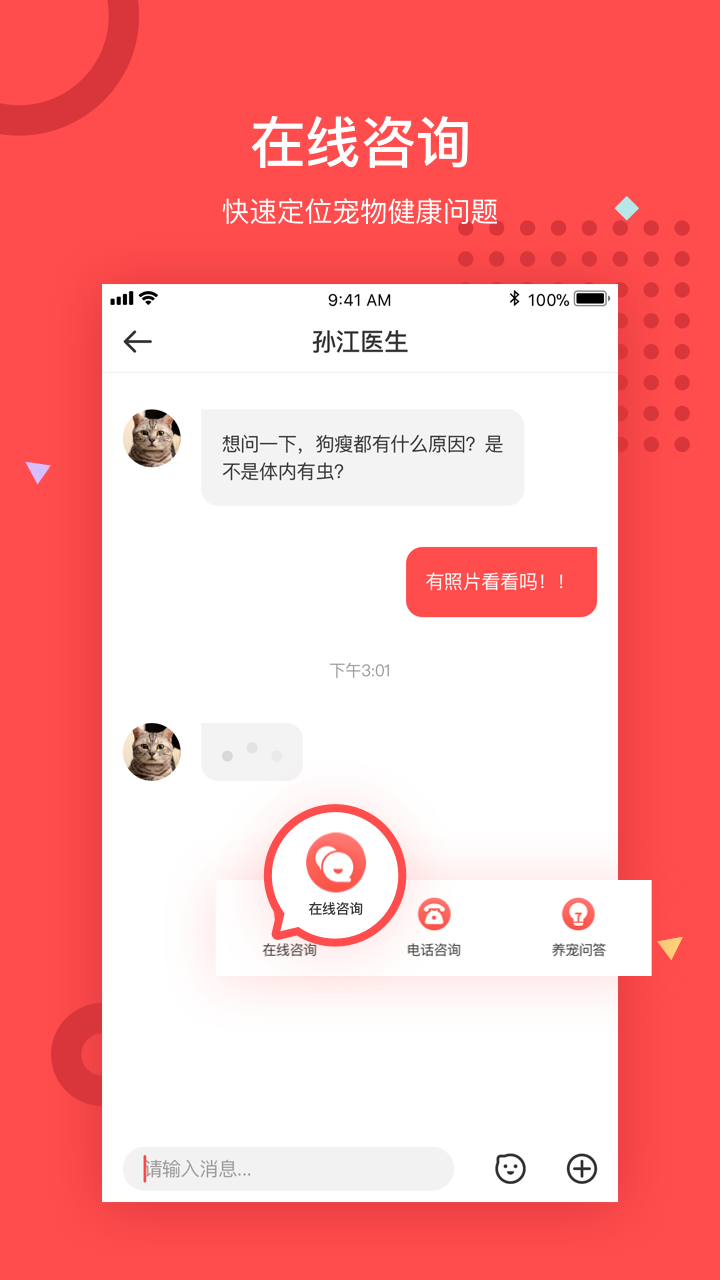 精英团队。 阿闻医生对进驻医师/医院门诊拥有 严苛的审批/评价指标体系,大家确保每一位线上医师都具有技术专业的职业资格认证和技术实力,由于这关联到每一只爱宠的身心健康,大家刑事追究。 从作用看来,阿闻医生有以下好多个特性: *24小时线上为宠主出示宠物诊疗和宠物美容护肤等服务咨询; *全新升级视頻作用发布,技术专业训宠教程视频,宠友DIY视頻; *文图资询,让医生迅速精准定位爱宠的健康问题; *“一键通话”马上会出现医师与您联络,为您守卫爱宠身心健康; *能够提早预定宠物接诊、美容护肤、预苗、除虫、寄养宠物等服务项目; *强劲的精准定位作用能够让您迅速寻找周边的宠物医院门诊和医师; *网上管理方法爱宠就医/美容信息,随时随地查询爱宠身心健康纪录; *互帮互助养宠物解答,热情宠友/医师为您出示养宠物协助/提议。 =在线留言&反馈意见= 阿闻君个人微信号:rveter 阿闻医生的官方网站:http://www.rvet.cn