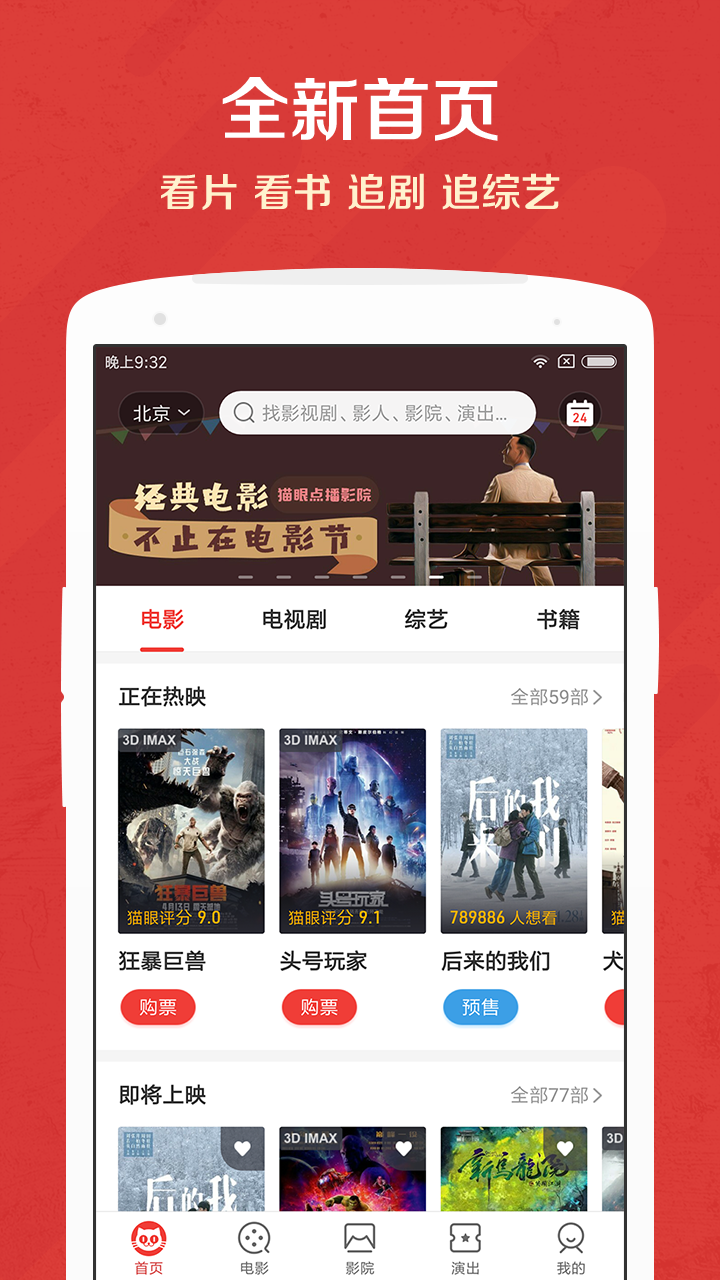 全民帮你选好片 ——百万级大娱乐资料库,电影电视综艺和明星的百科全书 热门预告、高清剧照、幕后揭秘和明星花絮,尽在猫眼 ——提前在线选座,不排队轻松霸好位 覆盖全国7000+家影院,实时查询放映场次,提前选好座不排队 ——正版电影周边,超多爱豆