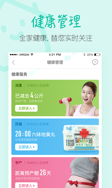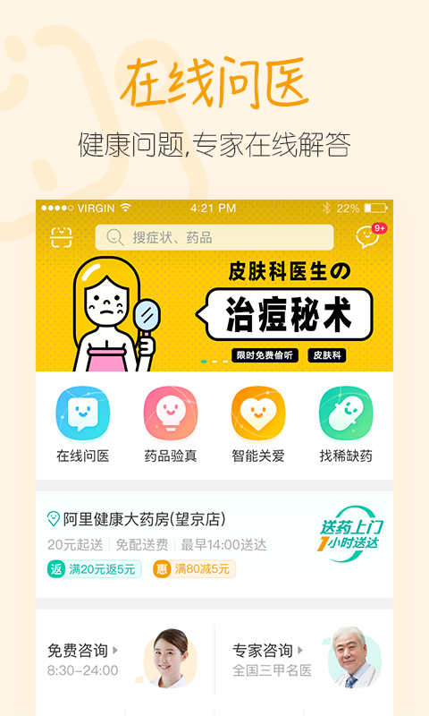 阿里健康(原名为中信二十一世纪),是阿里巴巴网集团旗下药业科技有限公司。凭着阿里巴巴网在电子商务平台、互联网大数据和云计算技术行业的优点,籍集团旗下经营的云端医院门诊、阿里健康APP,为客户出示及时、方便快捷的线上/O2O药业、诊疗、健康管理方法等层面专业服务。为医药健康领域出示全方位的互联网技术解决方法。 【健康服务】天气异常预警信息,家人血糖值出现异常提示。全家身心健康,替您即时关心。 【真情语音通话】无论家人在哪儿,真情语音通话都可以完全免费拨通。完全免费时间每月送。* 【家庭医生】签订专享家庭医生,家庭医生比你更掌握你。 【在线问医】聚集三甲名中医,迅速预约挂号,随时就医。 【健康之家】天猫商城药馆知名品牌/药店自营,也有健康保健/养生食材、医疗机械、成人用品等。 【周边药店】网上订单拿药,足不出门,送药上门。 【用药指导】技术专业医师具体指导,在线解答平时服药难题。 【优惠卡包】公司独立订制,让全部企业都身心健康起來。 【找药商品】帮您寻找稀有药物,解迫在眉睫。 大家希望给您更强的应用感受,请将您的意见与建议发送到大家的电子邮箱: alihealth-fb@service.alihealth.cn *一部分套餐内容手机号很有可能会被营运商扣除接通花费或是长途漫游费用