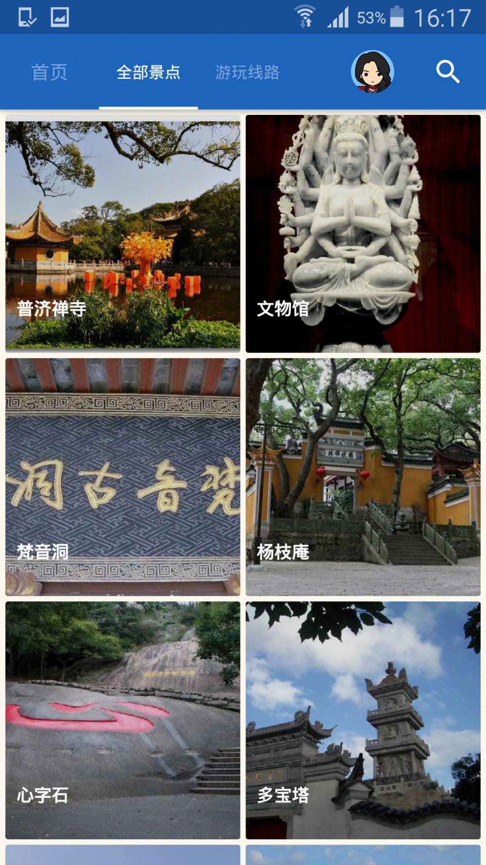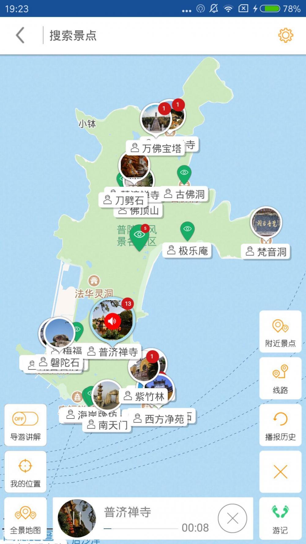 神秘感的寺塔崖刻、石头林木之外,海岛林木茂盛、花香鸟语,不但有冠径近上千年的古樟树,也有在我国独有的普陀鹅耳枥。而岛四周白浪围绕、渔帆竞发,银涛紫云围绕着翠绿的层峦叠嶂、清幽的古寺精舍,组成了一幅绚丽多彩的画轴。 技术专业的智能语音导游系统软件伴您享有美好的暑假。祝你旅行愉快!!! 作用: 导游-根据GPS定位为您广播每一个旅游景点的历史人文和内函 攻略