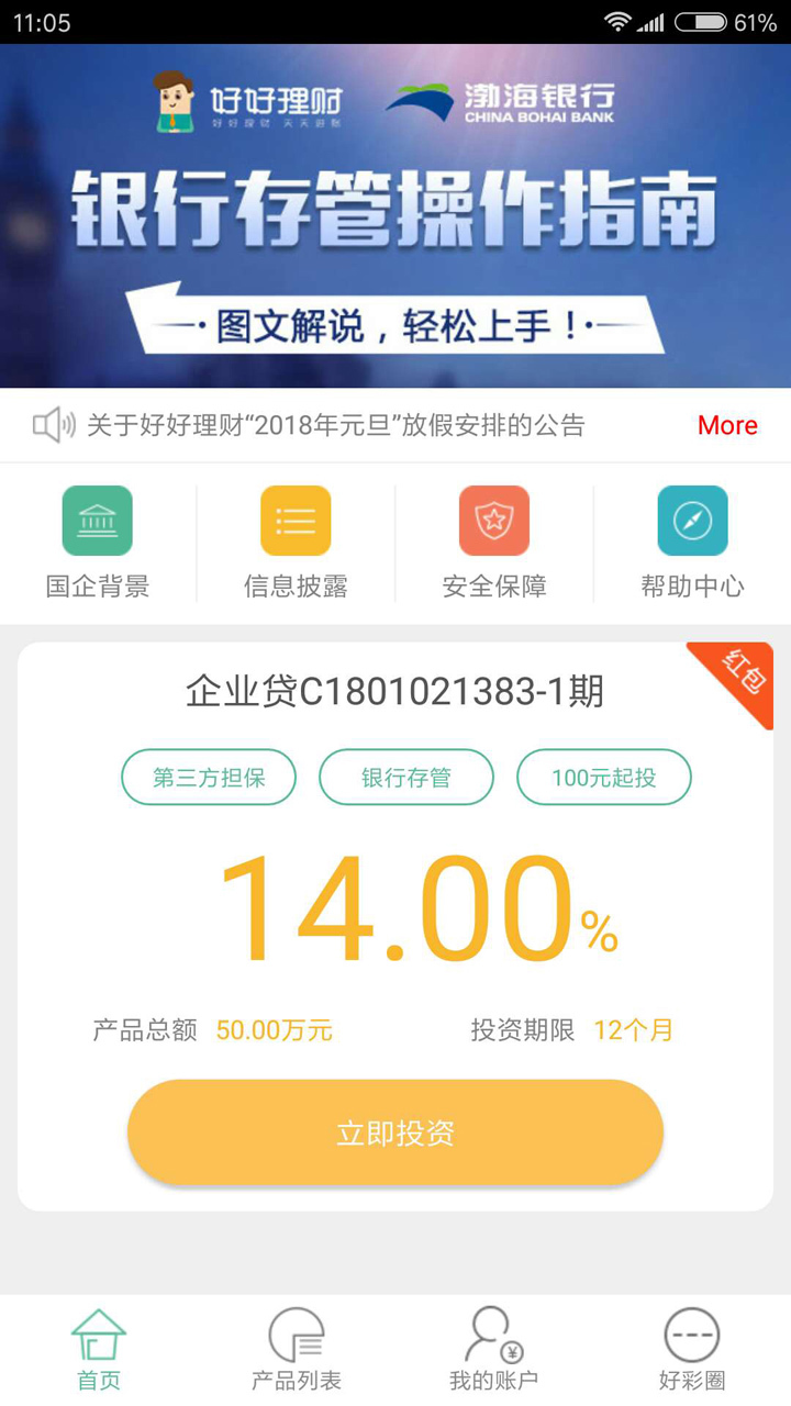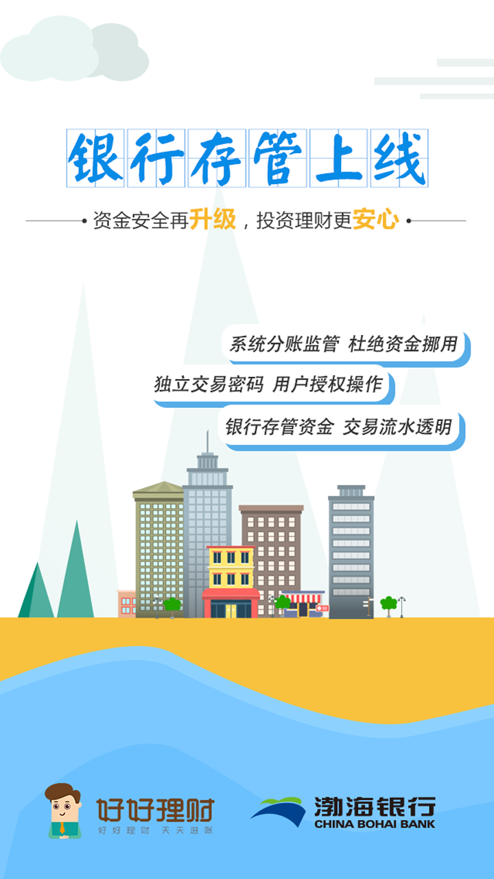 好好理财大力支持管控规定,携手并肩渤海银行,宣布全方位连接金融机构存管。金融机构存管完成了服务平台自筹资金和客户资产彻底防护,合乎了管控规定,进一步确保投资者资金安全。 好好理财(官方网站:www.haohaolicai.com)是由深圳深圳前海好彩金融信息服务有限责任公司用心打造出的网络贷款信息中介公司服务平台,申请注册实缴资本五千万元rmb,于二零一五年就在前两天发布经营。 好好理财自发布至今,借助国有资本控投情况优点,服务项目于众多项目投资客户高
