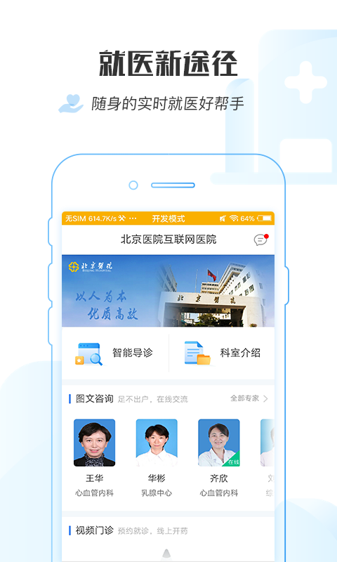 “掌上北京医院”是北京医院以移动互联、云计算技术、物联网技术、互联网大数据等特性“聪慧化”科技革命。“掌上北京医院”致力于医院门诊目前服务项目基本上,根据科室医生、智能化导诊、图文资询等多种多样简单化病人看病流程作用,降低就诊等待時间,改进病人就诊感受,提升 诊疗服务水平。 -----关键作用----- 1.科室医生:一键查询各科室本月医生排班表; 2.图文资询:在线图文接诊; 3.智能化导诊:仿真