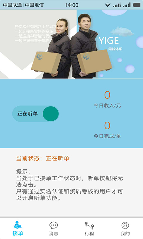 壹配送运营专员APP是壹客送网络技术有限责任公司发布的一款同城网速送手机软件,具备下列特性: 1、利用自主创新的大数据算法测算大量配送订单信息的共性,建立共性需求,依据共性需求的特性搭配合适的代步工具,快至三十分钟送到,智能化拼团,大幅度降低配送成本费,提升 配送员收益。有效利用配送資源。 2、在配送速率上好于传统式快递公司,配送价钱上小于新起互联网技术配送。 3、互联网大数据配送系统软件还能够对全部县区或是货运物流、仓储物流产业园区的货品类目、总数、寄往地、车子情况等开展实时监控系统,即时配制车子考虑建立的共性需求,用设备智能化调度替代繁杂的人工调度,真实完成降低成本的急速配送。