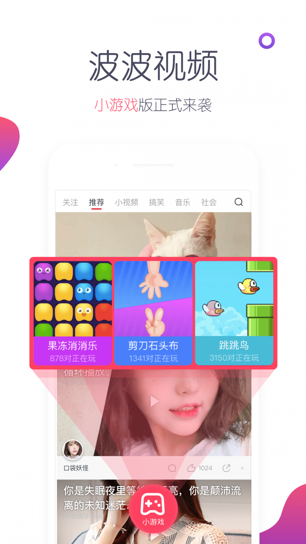 播放视频的基本上,提升小游戏作用。在这儿你能再度追忆儿时的经典游戏五子棋,剪刀石头布;还可以玩时下最火网络红人游戏如开心消消乐,答题王等!跟诸多波友们一起互斗赢特惠大奖! 作用闪光点: 【有的看也有的去玩】 有游戏,有答题,有视频,也有抽奖活动!就连大家的朋友都会玩,礼品那麼丰厚,万一被大奖砸中了呢! 【看的越大,强烈推荐越准】 如果你用一遍,个个就能“唰”的计算什么就是你喜爱的视頻內容,比较有限的時间自然要用在自身喜欢的东西上呀! 【归类大量,內容更丰富】 歌曲/搞笑幽默/社会发展/搞笑小品/日常生活/