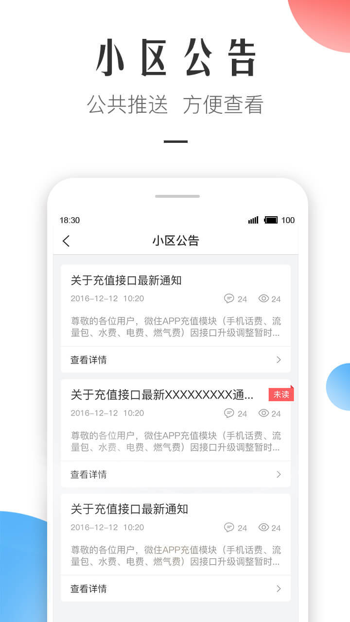 远程控制物业信用卡账单、通告、消息提醒等,适用手机微信、支付宝钱包。 微住的重任,联接每一个家中。 关键作用及服务项目: 【物业缴费】24小时随时一键缴费,手机上查询物业账单明细。 【住宅小区公示】及时消息推送、随时随地把握,确保居民100%接到通知。 【投诉中心】业主能够线上把要投诉中心的內容,意见反馈给物业管理办,管理人员会妥善处理并回应。 【公共性检修】业主能够根据手机相机的方法报障,检修情况和結果一目了然,还能够点评打赏
