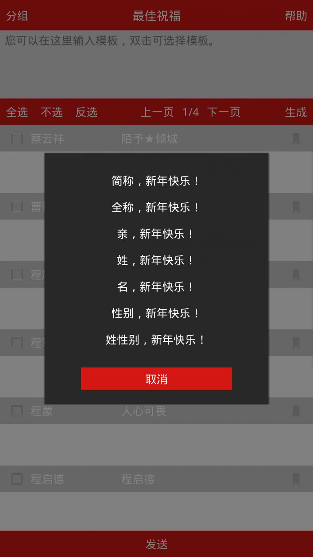 免费下载 大小: 下载:次 最佳祝福 安卓版 传统习俗 生活助手 模版 支 持: 分 类:软件下载 大 小: 开发者: 提 现:10 说 明: 下载量:次 发 布:2023-07-21 14:20:48 手机扫码免费下载 纠错留言 #最佳祝福 安卓版截图 #最佳祝福 安卓版简介 最佳祝福是一款可以带称呼向好友群发祝福的实用生活助手。 它可以根据好友的昵称、备注、性别等信息,智能地套用模版,生成带称呼的祝福消息。并可以让您一键发送出去。 我们致力于在弘扬中华传统习俗的同时,又帮助您节约大量宝贵时间。