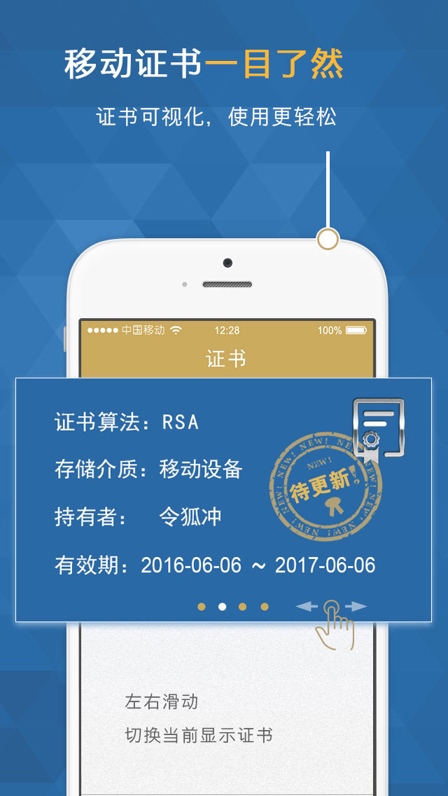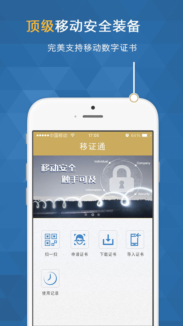 移证通定坐落于上海数字证书认证机构有限责任公司的电子认证综合服务平台的移动互联通道,为手机用户和所连接的移动应用出示电子认证服务项目。根据该商品,我们可以在移动设备上完成数字证书申请办理、下载、储存到证书储存地区、升级、撤消等数字证书生命期管理方法作用。该商品还能出示SDK供第三方移动应用启用,从移动设备的证书储存地区中获得证书,完成挪动证书登陆、签字、验签、数据加密、破译等安全性作用。 该商品的关键作用特点以下。 客户帐户管理:账号登录、帐户销户、改动账户密码、显示信息登录帐号; 证书下载:查看待下载证书目录、查看证书申请办理情况、提交公匙、下载证书、储存证书; 证书管理方法:查询证书、改动公钥动态口令、导进系统软件、删掉证书; 扫一扫:适用扫描二维码开展电子认证,适用融合第三方WEB运用开展“快速登录”和“扫二维码签字”等应用领域; 应用纪录:供客户查询移动设备中数字证书的历史时间应用状况; 客户服务:服务点、服务热线、帮助中心; 系统配置:app启动页、功能介绍、版本信息内容、关于我; 版本检验:程序流程起动的时候会开展版本检验,若发觉新版本,会提醒客户开展下载升级; UMSDK:出示证书登陆、电子签名、认证签字等服务项目插口供第三方移动应用启用,以完成“移动应用证书登陆”和“移动应用电子签名”等挪动验证应用领域;