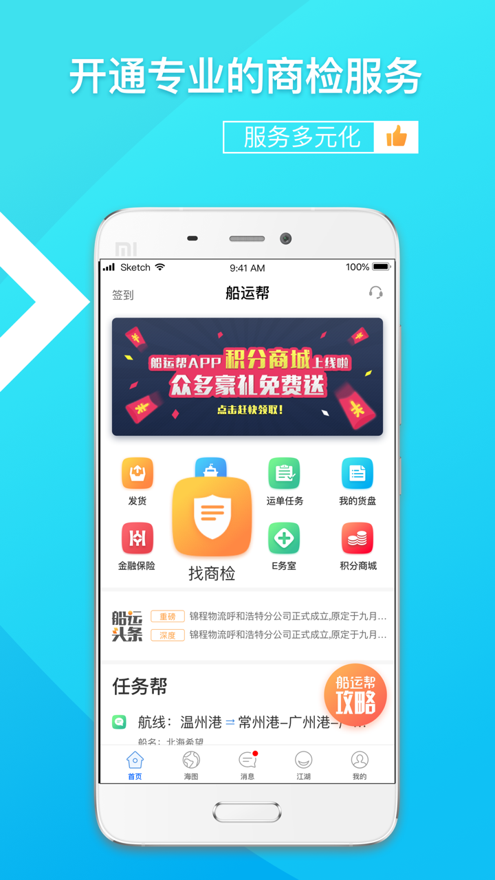 技术专业、值得信赖的聪慧船运综合服务平台。 根据数据分析技术性,为船运有关方出示全过程可视化物流追踪、合同书物流管理方法、临时性找船服务项目、商业保险、运输费保理、线上报检、线上船代、在线医疗、船舶维修、船给油等一站式船运服务项目,提高客户体验、造就价值,创建高