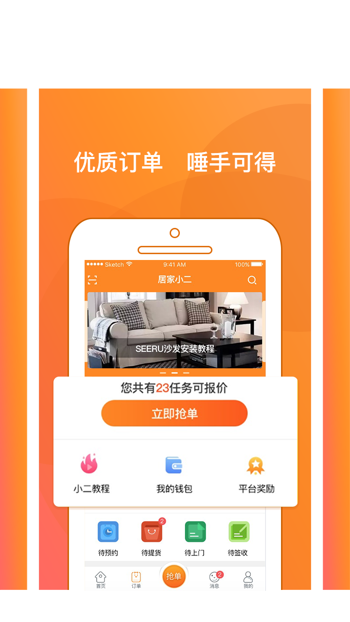居家小二是根据家居电子商务行业的O2O朝向家具服务项目师傅的一款APP,联接家具服务项目师傅与家具顾客,为家具师傅出示更加丰富多彩、人性化、及时贴心服务,是家居技能加点领域的uber;运用共享经济模式,对社会发展师傅开展有效资源分配,完成师傅接单子的扩大开放、实用化、及时化。 关键作用: 1. APP消息推送订单,师傅根据价格获得订单,无价差让师傅舒心挣钱; 2. 预定取货查收即时消息推送数据可视化,全过程确保; 3. 订单查收后师傅能够根据APP银行卡绑定轻轻松松取现并不是事情; 4. 居家小二