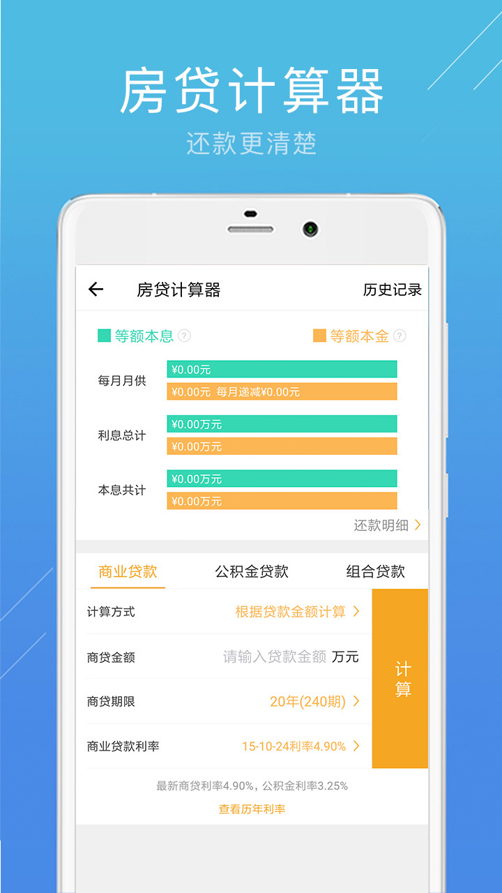 房贷计算器是一款用以查看还款清单,计算每个月还款额、还款本金、贷款利息和剩下本金的手机软件,另外能够依据您的贷款总金额,智能化挑选贷款