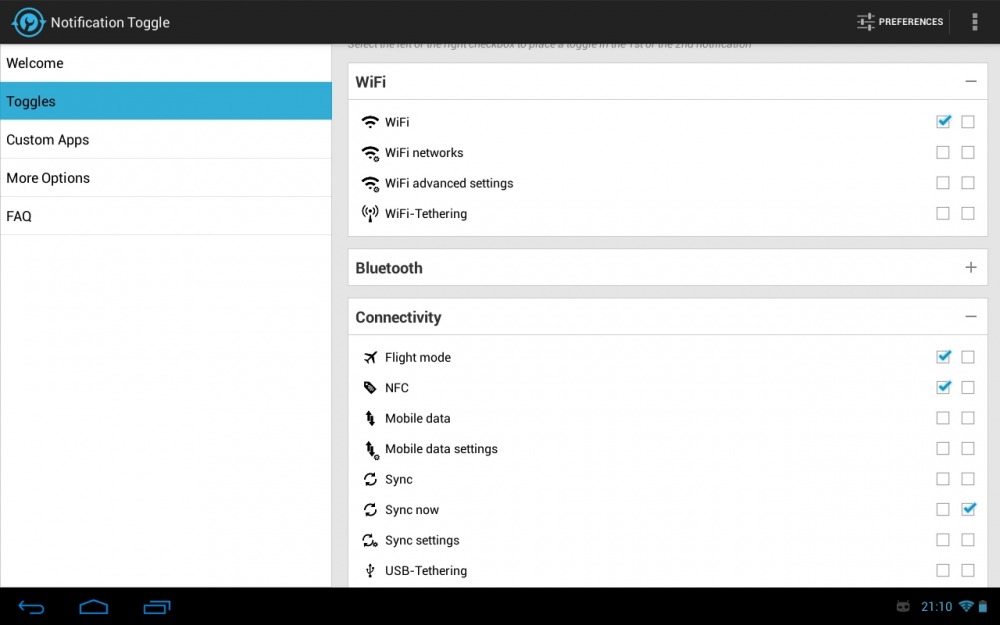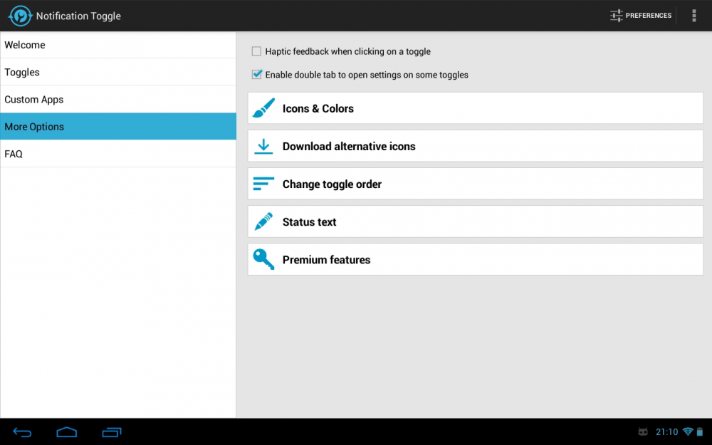 NotificationTogglecreatesnotificationsintheAndroidstatusbartoletyouquicklyswitchWiFi,Bluetooth,Silentmode,ScreenrotationandFlightmodeonandoffortoadjustthescreenbrigthness(andmanymore...)Youcanalsoaddshortcuttoyourownappsintothenotificationbar!Inthesettings,youcanchoosewhichnotificationsshouldbeactive.Allicons&colorscaneasilybechangedthroughtheappforfullcustomization!Somenotes:•Noteverytogglewillworkoneverydevice•Somesettingsaren'tchangeablebyuserapps,soitwillbringyoudirectlytotheAndroidsettings•Excludefromtask-killers!•Sometogglesrequirerootaccess•Theappcannotremovethebuild-intogglenotificationonSamsungphones•PleasereadtheFAQintheappbeforepostingareview--------------------Availabletoggles&shortcuts:•WiFi•Bluetooth•Sound/Vibration,Sound/Silent,Soundmenu•Brightnessmode/menu/5predefinedstages•Screentimeoutdialog•Wakelock•Rotation•Flightmode•Mobiledata•NFC•Flashlight(mightrequire"TeslaLED"app)•Sync&Syncnow•WiFi-&USB-Tethering•Music:previous/next/pause•WiFisettings/advancedsettings•Bluetoothsettings,Bluetoothvisbility•GPS•Mobiledatasettings•Datausage•Battery•Camera•nextWallpaper(requires"WallpaperChanger"app)•Lockscreen(requires"DelayedLock"app)•Shutdown&Reboot(requiresroot)•ownapps&shortcuts(shortcutsfeaturerequiresanin-apppurchase)------------------Thisawesomeappiconismadebyhttp://www.graphical360.com:)Ifyoudon'tlikethedefaulticons,clickon'Icons&Colors'anduseyourowniconsorusethe'IconDownloaderforNT'appdodownloadalternativeiconsmadebyxdausers.--------------------Permissions:ACCESS_FINE_LOCATION-toggleGPSonAndroid2.2devicesACCESS_NETWORK_STATE-togglewifitetheringBILLING-forin-appbillingBLUETOOTH_ADMIN&BLUETOOTH-toggleBluetoothCALL_PHONE-directcallcontactsfromnotificationCAMERA&FLASHLIGHT-turnoncameraflashlightCHANGE_NETWORK_STATE-togglemobiledataon2.3 CHANGE_WIFI_STATE&ACCESS_WIFI_STATE-toggleWiFiEXPAND_STATUS_BAR-toclosethestatusbaronICSdevicesMANAGE_USB-toggleusbtetheringMODIFY_PHONE_STATE-mobiledatatogglingonAndroid2.2READ_EXTERNAL_STORAGE-toloadcustomiconsRECEIVE_BOOT_COMPLETED-placethenotificationsafterbootSYSTEM_ALERT_WINDOW-necessaryonAndroid2.xfordetectingwhichtogglewasclickedVIBRATE-forhapticfeedbackoptionWAKE_LOCK-forthewakelocktoggleWRITE_APN_SETTINGS-fallbackmethodtotogglemobiledataonAndroid2.xWRITE_EXTERNAL_STORAGE-tosaveshortcuticonslikecontactpicturesWRITE_SECURE_SETTINGS-GPStogglingonrootedpre-4.3devicesWRITE_SETTINGS-totogglevariousstufflikerotation&screenbrigthnessWRITE_SYNC_SETTINGS-togglesync