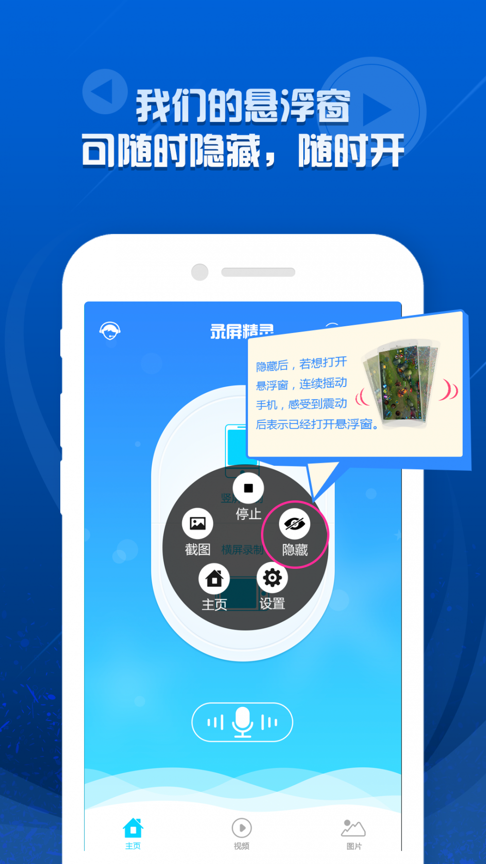 游戏录屏大师 录屏精灵(录屏权威专家,录屏大师),安卓手机系统十分比较好的手机录屏手机软件,专为手游游戏暖心设计方案,致力于手游游戏、视频、直播间、录影的录屏大师,不用root,没有广告,不卡屏,更清楚顺畅的手机游戏视频录制武器,纪录五杀一瞬间,共享朋友,尊为高手,赶紧来一起录制属于你的荣耀吧! 【手机软件作用】: 【录屏权威专家】适用全屏、坚屏录制,悬浮球录制,直播游戏,普清、超清、高清视频画面质量能够您选;适用录制视频分享至QQ好友、手机微信、电子邮件、及其适用加上到微信收藏、QQ个人收藏、手机蓝牙推送及其发送至pc端等; 【录屏大师】手机截图录屏任你选,适用王荣耀、