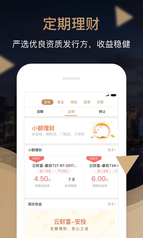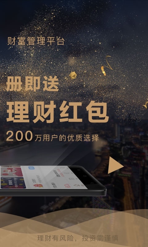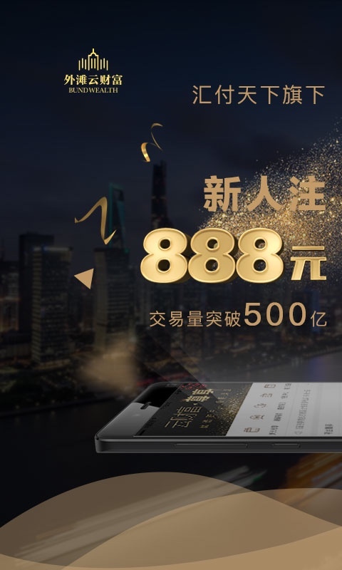 【新顾客特享】申请注册即送888元大红包! 【安全防范措施】 汇付天下集团公司公司股东情况,专业团队、优选产品、严苛风险控制; 合作者汇付金融业拥有中国证监会授予的《基金销售业务资格证书》; 第三方资金托管,资产同卡出入,取款更快一秒到账,确保客户资金安全。 【产品特性】 丰富多彩且合规管理的产品线 1.股票基金:包含近4000余支证券基金; 2.小额理财:短期理财神器,7-180天多限期随意选择,预期年化收益5.5%-7.2%; 3.话题讨论宝:1天期产品,每天猜跌涨,赢高收益; 4.自主创新产品:每月盛开,每个月付息比薪水还按时,预期年化收益率7.5%,提早锁住高收益; 5.理财保险:稳进产品,年化收益5%,买理财送重大疾病险。 【有关上海外滩云财富】 上海外滩云财富-中国著名综合性金融信息服务组织汇付天下倾情打造出的一站式财富管理系统。 根据导入欧美成熟销售市场财富管理模式及金融业从事历经