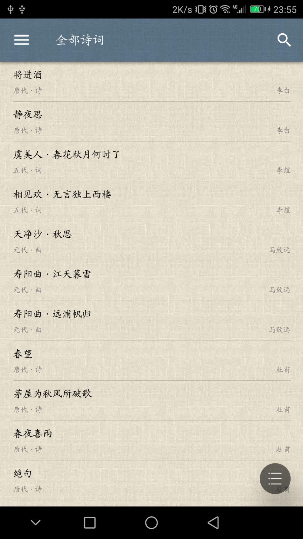 收录6000首诗词,包含秦楚汉、唐宋元、近代,近700数百位作家,包括诗词鉴赏分析和作者介绍,并含有古诗词朗读作用,支持当地和网站搜索诗词 1.古诗词集是纯碎的的古诗词阅读app。为客户出示全方位的诗词內容,权威性的注释译文翻译,雅致的视觉享受,就是你学习古诗词的极佳挑选。古诗词集收录了唐诗三百首,宋词三百首,元曲三百首,古诗三百首,诗经楚辞,全唐诗,全宋词等经典作品。 2.次之,古诗词集全方位遮盖了中小学,中学,普通高中的教学内容,便捷你按环节开展学习和记诵。古诗词集备受客户喜爱,是教师、父母和学员的亦师亦友,学习考試的必需武器。 3.支持按创作者、诗词名、诗词內容、诗词种类、诗词表述查看,让您快速搜索到相对內容。支持一键个人收藏、历史时间查询,让您能够便捷查询自身很感兴趣的诗词!全新升级排版设计优化算法,精美如书册一般!