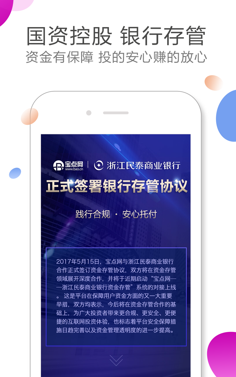 宝点网创立于二0一二年,六年老服务平台,上百万客户的不二选择;宝点网资金存管为浙江民泰银行业,安全运营更合规管理。稳进发展趋势向前走。宝点网于二零一六年十二月同天津市融信挚诚达到战略合作协议,宣布变成国有资本控投金融投资平台。 【安全防范措施】 1.宝点网与民泰银行签署资金存管系统软件宣布发布 2.服务平台客户超上百万,总计成交额近50亿人民币 3.金融机构级经营风险控制,让客户资金安全安心 4.熊猫管家