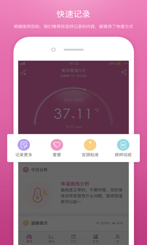 收集口腔内部内溫度做为参照。根据记录在月经周期内的基础体温曲线图能反映女性身体上的许多 难题,能够合理的检测和管理方法女性生殖健康。 经期不准、备孕期艰难、当然避孕措施、孕初期身心健康,诸多很有可能正给你头痛的难题,通通交到棒米处理吧!假如你想要知道大量,赶紧来棒米,你将更为认识自己的身体哦!~ 大家的总体目标是: 让月经紊乱的女孩们都能已不苦恼经常性搔扰的例假; 让备孕期的准妈妈们成功迎来来自身的宝贝; 让当然避孕措施的MM能够随意享有爱; 让刚怀起宝贝的妈妈安安稳稳守候宝贝渡过不稳定的岁月~ 基本作用介绍 1.今天剖析:让你呈上贴心的身心健康剖析,给你对自身的身体了然于胸 2.迅速记录:依据应用目地,大家强烈推荐你坚持不懈记录的內容,都出示了快捷方式图标 3.基础体温管理方法:全自动绘图曲线图,出示多种多样护眼模式,了解人体体温信息更为非常容易 4.日历表编写:丰富多彩的每天记录,帮你管理方法多种平时身心健康信息 5.测排卵试纸小助手:智能识别测排卵试纸检测結果,并贴心具体指导啪啪時间。 悄悄说一句,在棒米2.0,就算拆迁多年的生理期信息也是非常容易的事儿哦,假如现在的你仍在用别的生理期可视化工具,需不需要来换一个“贴心管家”试一下?(大家把“出轨”做的很Easy哦) 就等着你啦!
