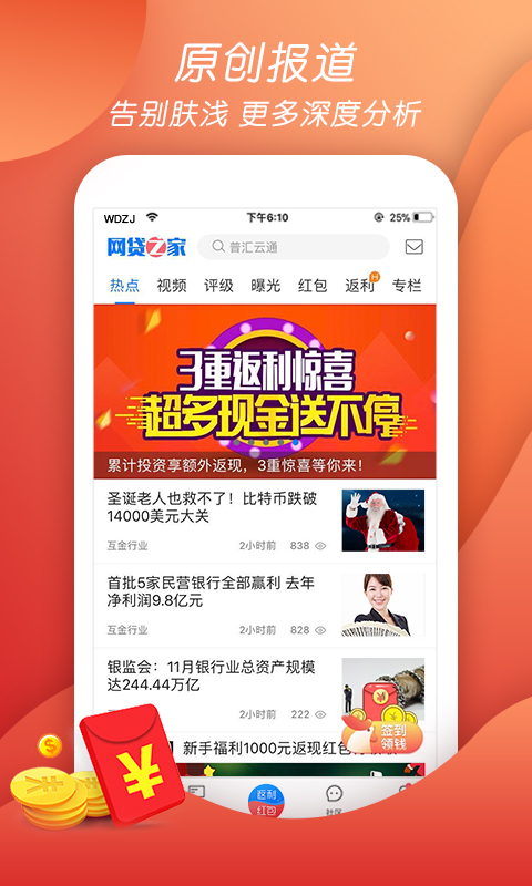 【公司简介】 网贷之家是我国权威性的P2P理财项目投资门户网! 网贷之家出示技术专业的新闻资讯、档案资料定级、数据分析报告、理财小区等。 网贷之家客户超700万,手机上理财项目投资就上网贷之家! 【APP详细介绍】 五大作用页,专享个人中心,网贷之家是您的暖心理财小助手。 【新闻资讯】:网贷界的头条 最前沿的新闻资讯一网打尽,让您迅速把握P2P动态性。 选用图片配文字、视频在线观看的方法让您轻轻松松看网贷! 【服务平台】:定级档案资料一键搜索,方便快捷放心 选情况,选年利率,选限期,总会有一款商品合适您! 网贷之家根据云计算技术创建各种网贷商品的多层次量化分析评定实体模型,致力于协助投资者项目投资。 合作者: 陆金所、人人贷、及贷、红岭创投、点融网、有利网、微贷网、翼龙贷、银客网、钱多多、拍拍贷、你我贷、名校贷、手机贷、飞贷、51信用卡权威专家、我来贷、投哪网、分期乐、趣分期、宜人贷、爱钱进、团贷网等百余家服务平台。 【发觉】:项目投资理财必需武器 高品质理财平台投资购物返利,为您安全性轻轻松松获得高回报。 服务平台抢红包活动自动更新,让您比照挑选最合适的理财平台。 【小区】:中国活跃性的网贷理财小区 在这儿,你能和志趣相投的干万网贷人共享理财小故事,另外还能够和理财权威专家线上互动交流沟通交流,变成网贷大咖。 极高人气值的曝出版面,以次充好、逃不出投资者的法眼,常看