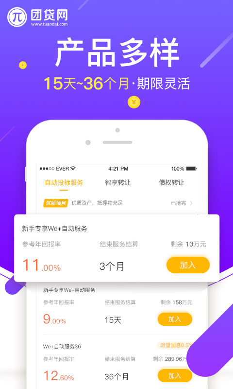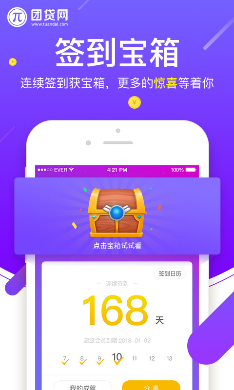 【初学者褔利】 1、518元红包 2888元现金红包; 2、新手特享11%参照年收益率; 3、邀请人项目投资平均奖赏五百元 0.5%提成奖赏; 4、刚注册的用户第一次在线充值赠予一个月qq超级会员。 【超770万用户信任的项目投资综合服务平台】 团贷网于二0一二年宣布发布经营,是一家致力于扶持中小企业的投资理财信息中介机构服务平台,着眼于向贷款人和投资者出示金融业信息