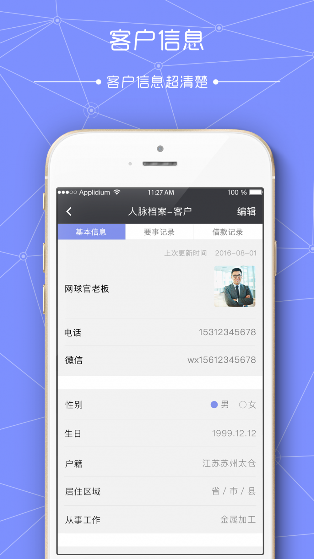 效率,使商务社交的实际效果显著提高,让信贷领域商务社交造成颠覆性创新的更改。 安石派选用的是云计算技术、互联网大数据、移动互联等全新升级技术性,为本人出示根据saas(手机软件及服务项目)的社交专用工具。 安石狂欢派对社交、crm等传统式手机软件开展了自主创新,有着人脉圈、人脉关系档案资料、要事记录簿等模板,独立开发设计了符合国家信贷领域从业者应用的挪动社交专用工具,并根据服务平台的方法,融合大量运用,使社交更为智能化系统,包含下列程序模块: 1、人脉圈:显示信息之前商务接待联系距今的日数,便捷掌握与各关系人的业务拓展状况。 2、同行业圈:将全部同行业开展梳理归类,可以开展同行业挑选。 3、客户圈:将全部客户开展梳理归类,可以开展客户挑选。 4、人脉关系档案资料:包含基本资料、要事纪录、协作纪录。 5、要事文本文档:任何人脉的要事归纳,便捷掌握近期商务接待进度。 6、扫一扫加同行业:扫一扫,彼此信息内容开展互换,会巨大便捷同行业中间的沟通交流和协作。