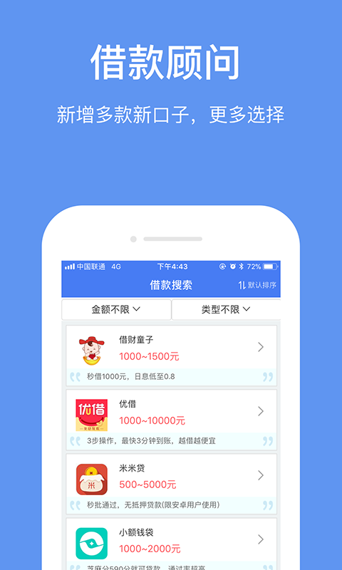 非常容易借为借款人出示技术专业的贷款站内搜索,协助借款人,足不出门,降低成本的进行贷款。靠谱的借款信息业务系统。 【数十万贷款产品对比,较差贷款机构网上申请】 根据互联网大数据智能化搭配,综合性较为强烈推荐下款快、信用额度高、利率低的贷款