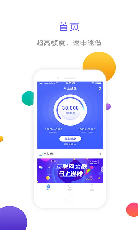 立刻进钱是一款聚集人工智能化、大数据征信查看、系统软件智能化审批、自助式借款还贷等控制模块运用作用于一体的新金融科技信息综合服务平台。借款周期时间为7-14天,灵便便捷,随借随还贷款,无需质押就可以轻轻松松借款,系统软件全自动审批,无需人工操作,对客户的材料保证一级保密性,无需交纳一切花费就能帮您处理迫在眉睫。 【商品特性】 ▲操作简易:纯网上操作,很简单三步就可以进行借款申请办理。 ▲信用额度灵便:贷款额灵便,随心所欲挑选。 ▲门坎较低:无需质押,无需贷款担保。 ▲利率较低:借款低成本,让您花钱安心。 ▲安全防范措施:严格执行有关相关法律法规,对顾客的隐私保护信息开展维护。