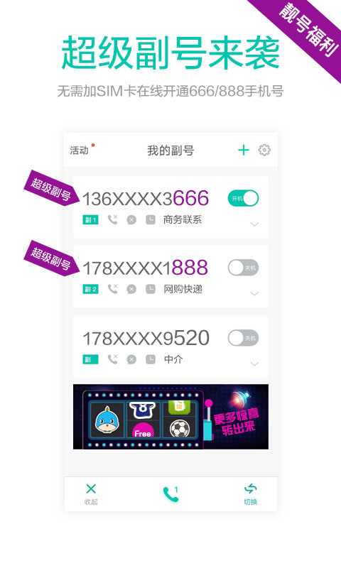 抢鲜感受中国移动通信一号双终端,手机上与腕表共享一个号,沟通交流抬腕达到。 666/888非常副号袭来,手机上减号不用卡,限定吉祥号码既开既用,天天开转也有意外惊喜等你! 我国移动和多号,一部手机有着好几个号! 网上购物、交朋友、购房、租房子、快递公司、打的,申请注册互联网账户仍在留您的真正手机号吗?仍在为每日接到电话骚扰、骚扰短信而觉得苦恼吗?用和多号,这种苦恼全都已不有!还能够免去另外带多手机的苦恼! 和多号具备下列作用: 【副号秒申请办理,一瞬间有着副号】 无需去营业网点,10秒左右就可以有着一个新手机号(副号/新号),副号为11位真实的中国移动号码,能够另外应用三个副号,角色定位随便转换; 【副号一键随时随地开机,电话骚扰进不去】 主、副号能够线上PK,副号可即时、定时开机,或关掉电話、短消息在其中一个作用,随意设定;您还能够随时随地撤消副号/新号,完全杜绝各种各样搔扰; 【通讯品质有确保,副号来电話不漏接电话】 营运商网络通信,副号电話接入时间较短,通话音质有确保; 【副号共享主号套餐内容,无需独立缴费】 副号可共享主号全部套餐内容,无需独立申请办理,业务流程作用费主号话费支付,省时省力; 【副号有确保,无需担忧遗失】 中国移动通信官方网荣誉出品,副号一经申请办理,可长期性拥有; 和别人联络,我仅用和多号! 【温馨提醒】 1.虚似副号仅适用收取和发送短消息、接通电话、接受手机彩信作用,不能申请办理一切联通增值业务,不然将造成 没法应用; 2.主号设定设置呼叫转移后,虚似副号将没法接电话; 3.虚似副号撤消后,将不能找到。 To众多客户,您在应用和多号全过程中,如碰到一切难题或意见和建议,可根据下列方法在线留言: 移动和多号客户QQ群:338354972 移动和多号官微:和多号 移动和多号官博:和多号 移动和多号官方网站:hdh.10086.cn